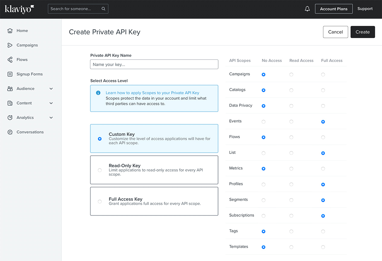 When creating your Private API Key, please provide Full Access to: Events, List, Profiles, Segments, and Subscriptions.